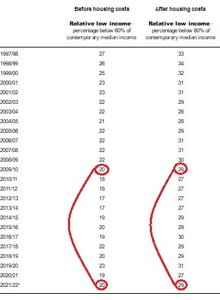 At the end of the New Labour period relative CP BHC was 19.98% in 2009/10. The latest figure available for 2021/22 is 20.01%.